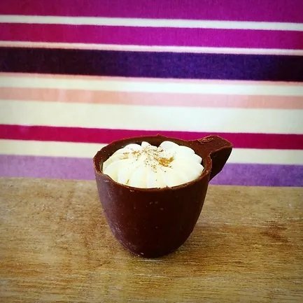 Xícara de chocolate meio amargo nobre recheado com mousse de café e chantilly.