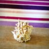 Brigadeiro branco recheado com um pedaço de ameixa seca, envolto com coco torrado.