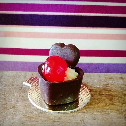 Cesta de chocolate ao leite (em formato de coração), leite condensado, creme de leite e cereja em calda. SEM GLÚTEN*